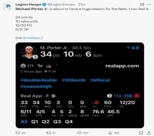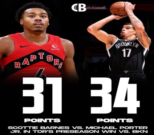 北京時(shí)間10月18日,NBA季前賽,籃網(wǎng)114-119惜敗猛龍。這場(chǎng)比賽籃網(wǎng)隊(duì)的核心小邁克爾-波特打出了加盟籃網(wǎng)以來(lái)的最佳一戰(zhàn),他全場(chǎng)比賽斬獲34分10籃板3助攻6記三分球。