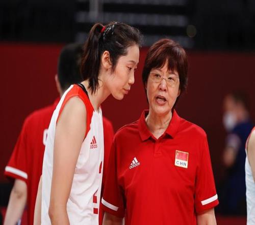 2021年7月29日,中國(guó)隊(duì)主教練郎平(右)與朱婷交流。當(dāng)日,在東京奧運(yùn)會(huì)女排小組賽中,中國(guó)隊(duì)以2比3不敵俄羅斯運(yùn)動(dòng)員。 中新社記者 韓海丹 攝。視覺(jué)中國(guó) 圖
