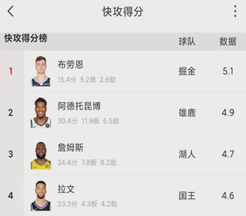 據(jù)統(tǒng)計,布勞恩上賽季場均快攻得分是5.1分,高居聯(lián)盟第一,他就像是一個彈力發(fā)射器,隨時可能啟動沖刺。