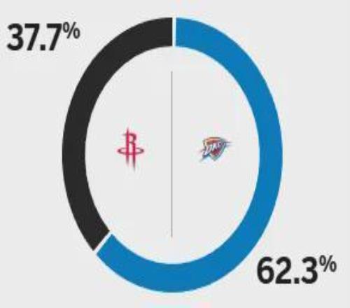 今日,ESPN對(duì)本場(chǎng)比賽進(jìn)行了預(yù)測(cè):衛(wèi)冕冠軍雷霆本場(chǎng)比賽勝率超六成,火箭勝率僅37.7%。