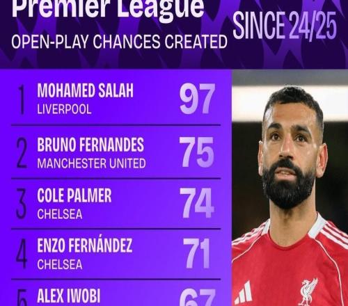 自上賽季以來英超運(yùn)動戰(zhàn)創(chuàng)造機(jī)會榜:薩拉赫居首,B費(fèi)第二